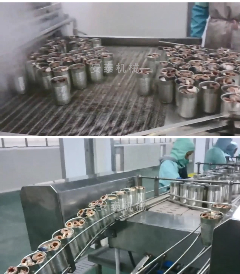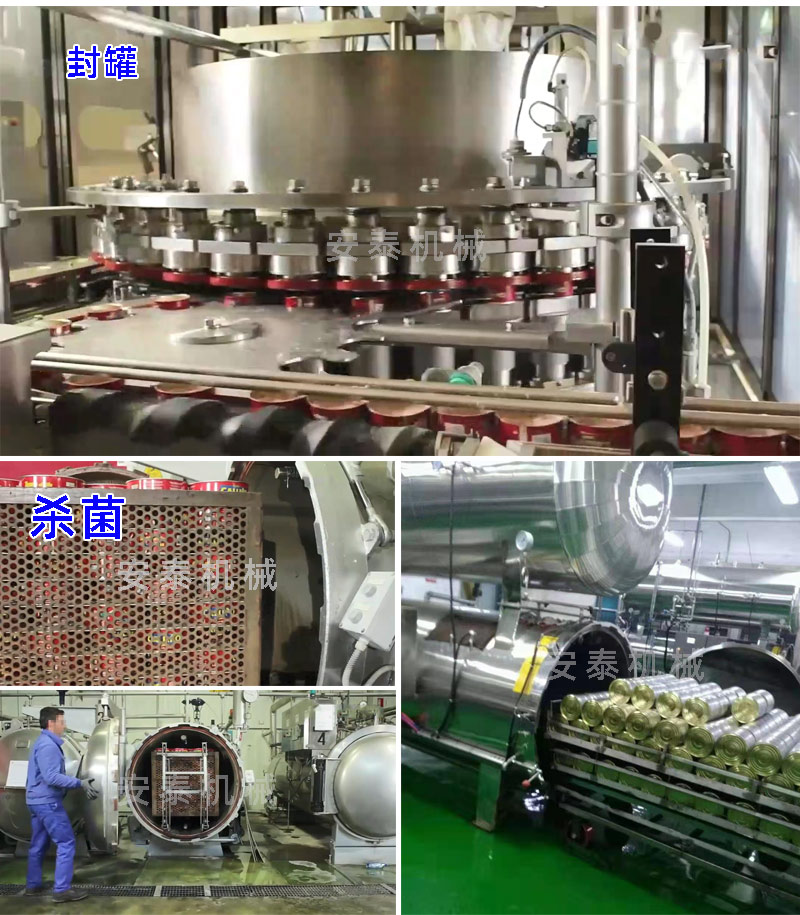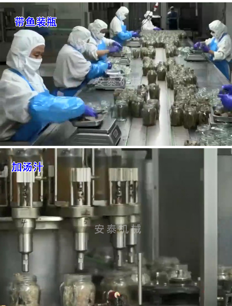 解凍——切斷——清洗——腌制——烘干——油炸————浸湯汁——裝罐(裝瓶)——真空封罐——高溫殺菌鍋——裝卸籠——實罐清洗——吹干——貼標——裝箱——碼垛