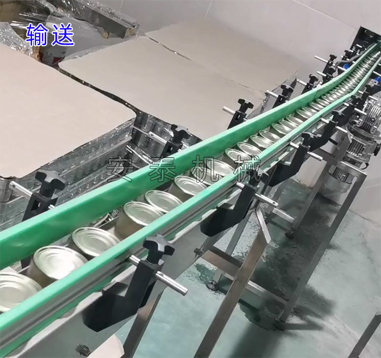 胸肉蒸煮——冷卻——三文魚蒸煮——冷卻——雞胸肉絞碎——加料汁混合攪拌——空罐清洗——灌裝——封罐——洗罐——裝籠——高溫殺菌——卸籠——洗罐——吹干——噴碼——拆箱——裝箱——碼垛